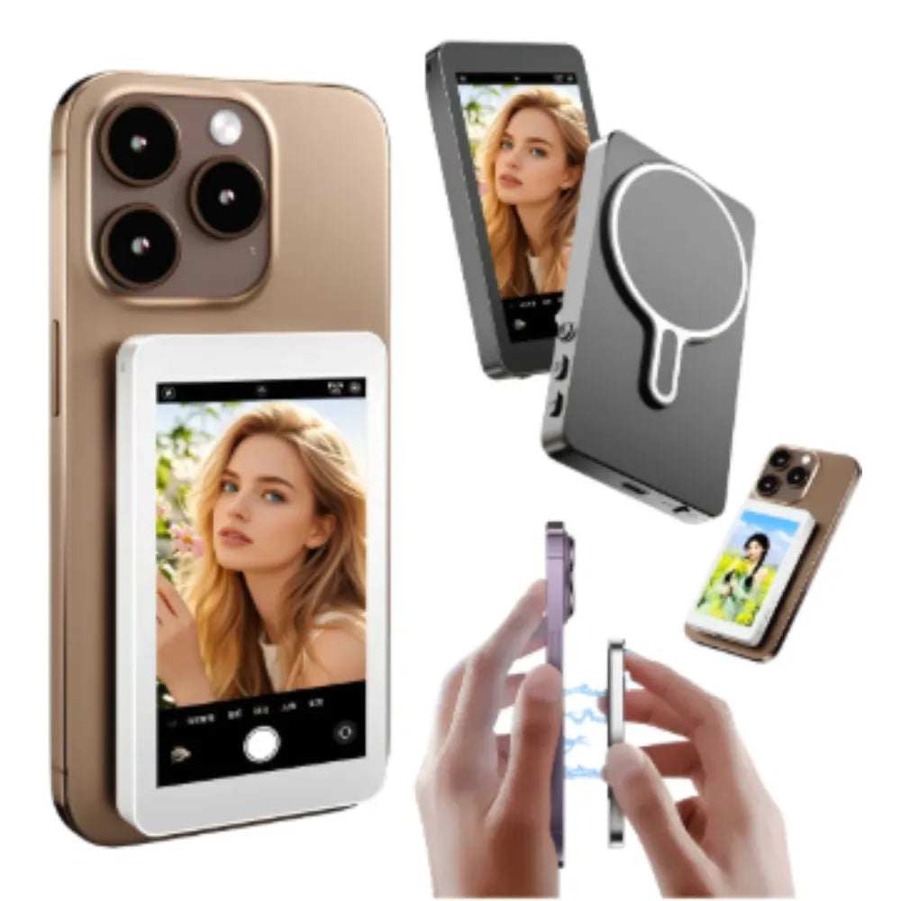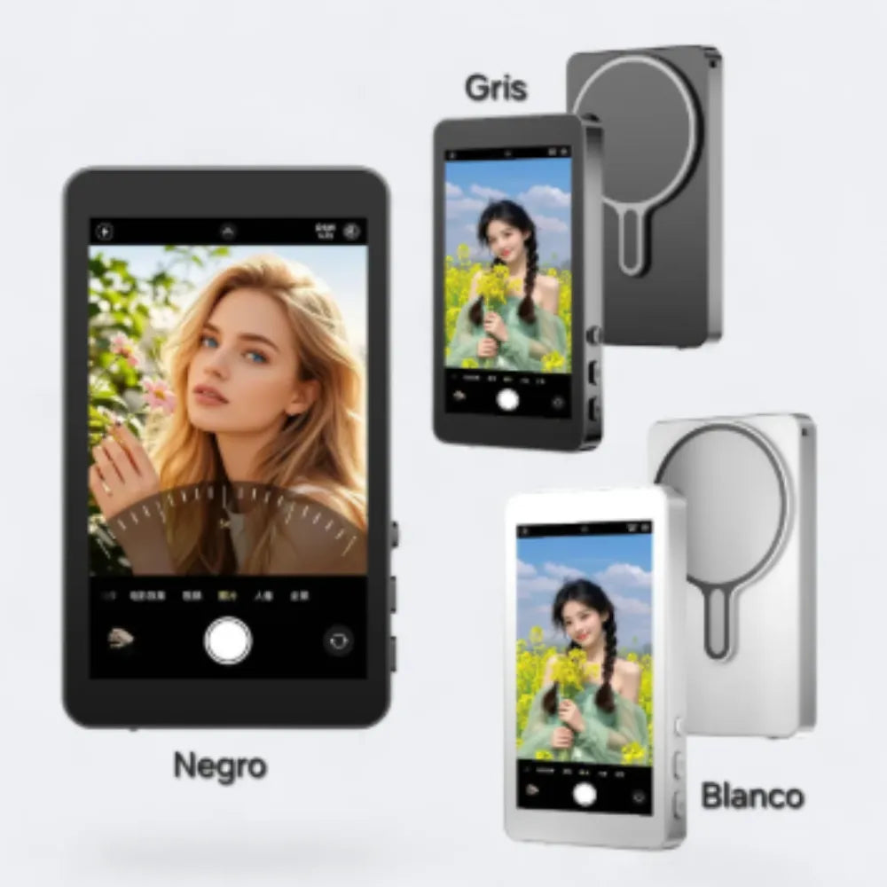 Este monitor para vlogs y selfies es una pantalla externa magnética que se conecta al teléfono para usar la cámara trasera como monitor en tiempo real — ideal para vlogs, transmisiones en vivo, TikTok y grabaciones de contenido. Tiene pantalla brillante visible incluso bajo luz solar, control remoto Bluetooth para disparo sin tocar el teléfono, rotación de imagen de 180°, y alimentación vía USB-C con paso de carga para mantener la batería del teléfono durante uso intensivo.